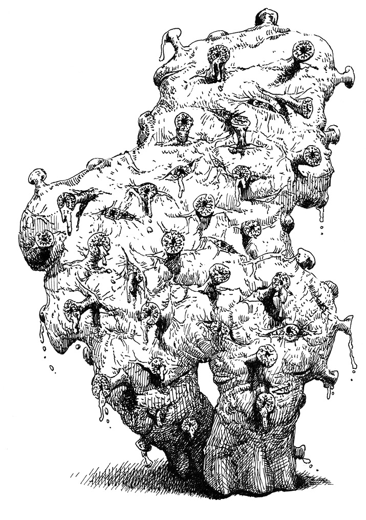 За спиной прозвучал стон, точно просящий о помощи, жалобный, но в то же время стылый, как сама смерть. Рука невольно ослабла. Корзина с грибами упала на землю. Нечеловеческий стон вновь расщепил острую тишину. Теперь он гремел тверже и ближе. Грибник обернулся. Перед ним стояло нечто, существо, не похожее ни на что на этой планете, как кусок необработанной глины. Оно едва переставляло тучное подобие ног и, казалось, явилось ниоткуда. Ни рук, ни головы. Склизкая кожа, покрытая шрамами, шевелилась, словно под ее толстым слоем кишели черви. Бледные рубцы расходились по мере приближения к жертве. Это были не шрамы – что-то похожее на присоски, как у пиявок. Из множества глубоких клыкастых отверстий доносились стоны, точно каждая душа, сожранная этим чудовищем, взывала о помощи, страдала, находясь внутри уродца. Оно испускало неприятный кисломолочный запах.