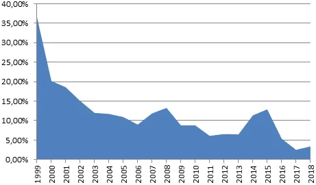 Снижение продолжалось вплоть до 1998 года, когда по итогам темп вновь скакнул с 11,0 % прошлого года до 84,5 %. Затем – снова снижение. Только к 2000 году жесткая денежно-кредитная политика смогла выровнять ситуацию и затормозить инфляцию.