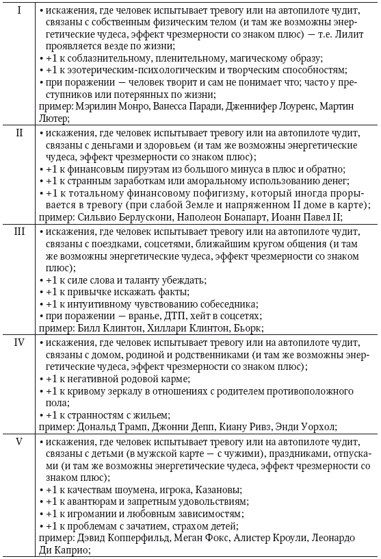 • параллельно с индивидуальными прогностическими влияниями и фоновым проявлением часто Лилит намекает на свое существование в соответствии с девятилетним циклом (9–18–27–36–45–54–63 года и т. д.).
