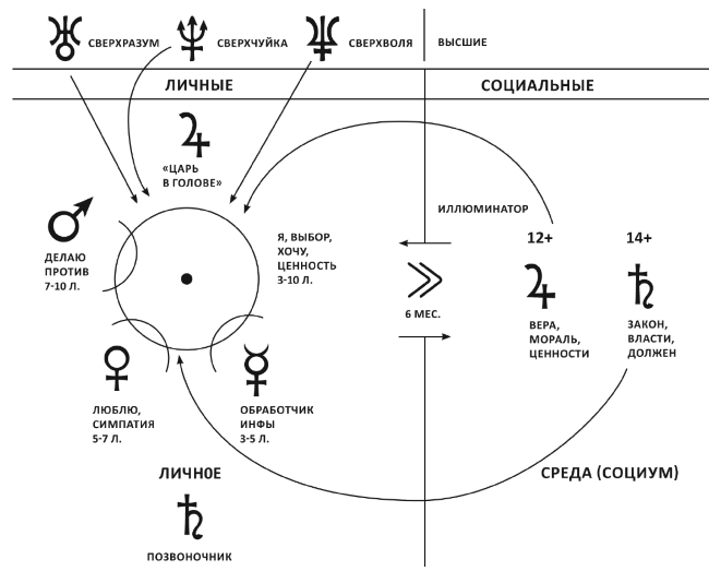 • родительские (Юпитер-Сатурн, фрейдовское суперэго, определяют правила и мораль, ограничивающие спонтанные желания и задающие форму проявления человека);