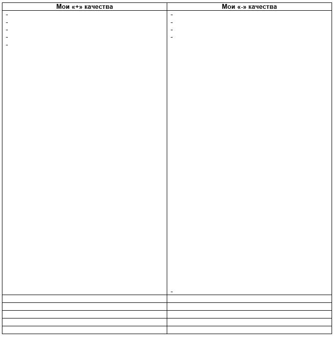 “Владеешь информацией – владеешь миром”, – сказал Ротшильд. И он прав. Нам важно встроить эту формулу в нашу “силу”. Оцените, насколько хорошо Вы знаете себя? Напишите все свои положительные и отрицательные качества. Пишите всё, что Вы о себе думаете, как Вы себя видите, что Вы чувствуете: хороший повар, компанейская душа, весельчак, зажигалка и т.п. Только пишите в больших белых прямоугольниках. Ниже отведённые строчки нам понадобятся чуть позднее.