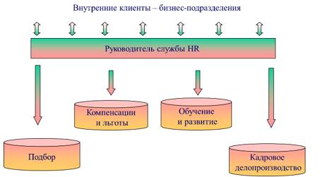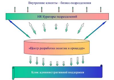 Как бизнес партнёр HR-служба осуществляет взаимодействие как с внутренними клиентами – бизнес-подразделениями, так и с центром разработки политик и процедур, воздействуя через него на блок административной поддержки.