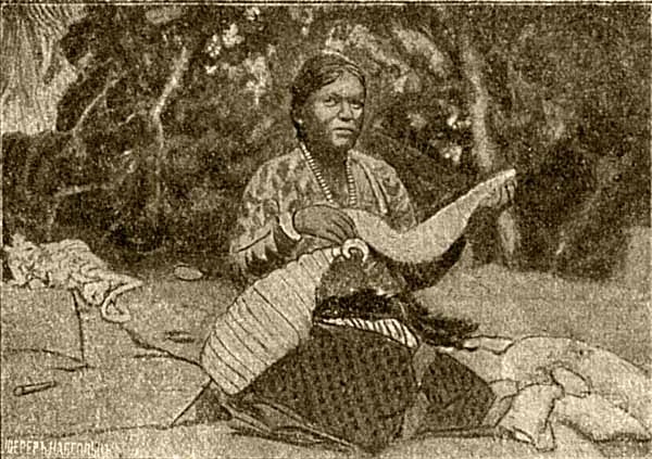 Весь день индейской женщины заполнен. Как ни просто хозяйство, но оно все лежит на ней. Надо и пищу приготовить, и за ребятами смотреть, и посуду делать, и корзинку приготовить, и одеяло выткать.