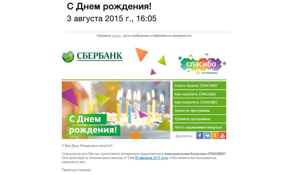 А теперь представьте, что этот опасный механизм вы своим письмом запускаете даже раньше обычного, не за неделю, а сразу за месяц. «Не забудь подвести итоги, дружок», – словно бы говорите вы ему. Зачем? Если хотите дать лучшие условия, предложите их прямо в день рождения клиента на месяц вперед. Имениннику будет не менее приятно. Сделать же рассылку, даже автоматическую, несложно по людям, которые родились не «вообще в августе», а конкретного числа. Вы же не поздравляете всех друзей, родившихся в определенном месяце, сразу первого числа, впрок?