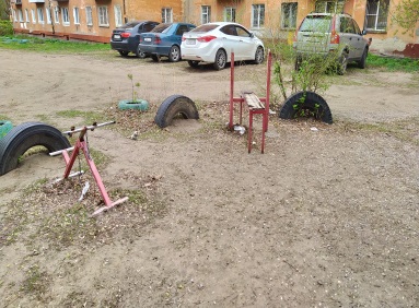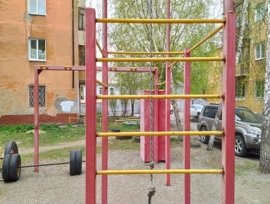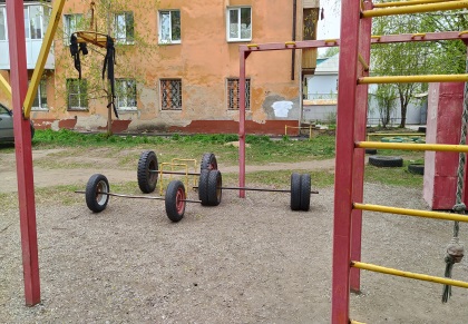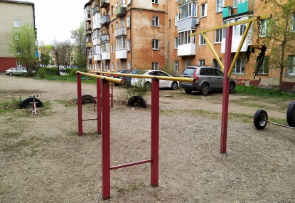 Используйте тренажеры и подручные средства, которые есть на вашей спортплощадке. Например, на этой площадке есть самодельные штанги и скамья для жима лёжа.