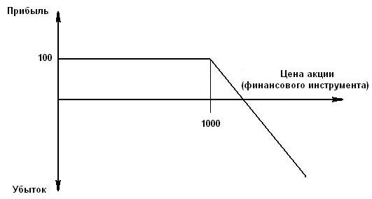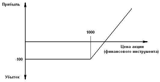 Как видно на рисунке 3.3.2.1 на оси X находиться спот цена акции, либо другого финансового инструмента, к моменту истечения срока действия опциона. Если курс акции равен или ниже 1000 руб., то опцион не исполняется (горизонтальный участок графика), и инвестор несет убыток в размере уплаченной премии, т.е. 100 руб. Если курс базового актива выше 1000 руб. то трейдер – покупатель, может исполнить опцион. Однако на отрезке от 1000 руб. до 1100 руб. исполнение опциона будет не выгодно и только поспособствует уменьшению величины потенциальных убытков. Прибыль держатель опциона получит только, когда курс акции превысит 1100 руб, т.е. величина страйка плюс уплаченная премия.