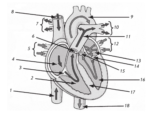 Рис. 1. Строение сердца:1 – нижняя полая вена; 2 – правый желудочек; 3 – трехстворчатый клапан; 4 – правое предсердие; 5 – легочные вены, по которым кровь поступает из легких; 6 – клапан легочной артерии; 7 – легочные артерии, по которым кровь поступает в легкие; 8 – верхняя полая вена; 9 – аорта (восходящая часть); 10 – легочные артерии, по которым кровь поступает в легкие; 11 – ствол легочной артерии; 12 – легочные вены, по которым кровь поступает из легких; 13 – левое предсердие; 14 – двухстворчатый (митральный) клапан; 15 – аортальный клапан; 16 – левый желудочек; 17 – межжелудочковая перегородка; 18 – аорта (нисходящая часть)