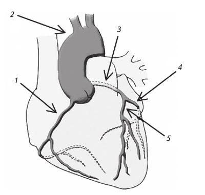 Рис. 2. Система кровоснабжения сердца:1 – правая венечная артерия; 2 – аорта; 3 – левая венечная артерия; 4 – огибающая ветвь левой венечной артерии; 5 – передняя межжелудочковая ветвь левой венечной артерии