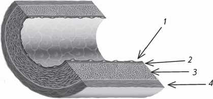 Рис. 3. Строение артериального сосуда:1 – эндотелий; 2 – соединительнотканная прослойка; 3 – средняя оболочка; 4 – наружная оболочка