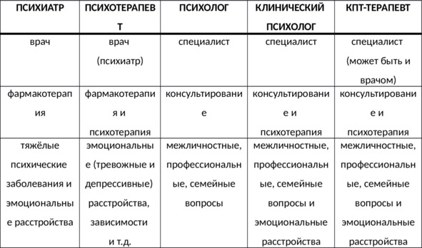 Многие люди имеют достаточно смутное представление о том, чем же всё-таки отличаются специалисты, которые могут им помочь. Для того чтобы прояснить ключевые отличия профессионалов, работающих с эмоциональными расстройствами, полагаем важным кратко охарактеризовать специфику деятельности каждого такого специалиста (см. таб. 1).