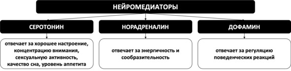 Предметом веры многих врачей-психиатров (а именно сторонников широко известной теории химического дисбаланса) является так называемая «святая троица» нейромедиаторов (серотонин, норадреналин (норэпинефрин) и дофамин). С точки зрения представителей этой теории, симптомы депрессии связаны с нехваткой или некорректной работой того или иного нейромедиатора (нейротрансмиттера) – химического вещества, способствующего «общению» нейронов в синаптической щели – пространстве между нейронами. Иными словами, когда нейротрансмиттеров (серотонина, норэпинефрина и дофамина), являющихся передатчиками сигналов между нейронами мозга, начинает не хватать, или когда их активность снижается, развивается депрессия (в то время как противоположные (эйфорические) состояния, по мнению адептов концепции химического дисбаланса, наступают вследствие избыточного количества или «гиперактивности» нейромедиаторов). Однако, как замечает врач-психотерапевт Дмитрий Викторович Ковпак, нейромедиаторы не создают, а лишь обслуживают психические процессы. К тому же в подавляющем большинстве случаев депрессия всё же имеет невротическую природу, говоря иначе, связана с психогенными факторами.