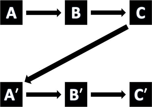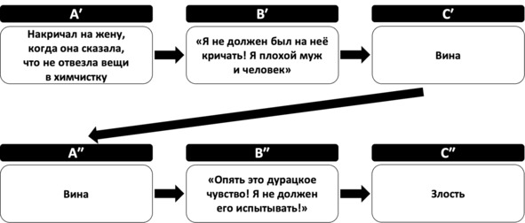 Однако по поводу эмоций (С), являющихся следствием мыслей (В) о каком-либо событии (А), у людей нередко возникают вторичные мысли (В′), приводящие к вторичным эмоциям (С′). В этом случае вторичным событием (А′) выступает изначальная эмоция (С). Например, тревога (С), возникшая из-за катастрофических мыслей (В) во время полёта на самолёте (А), может трактоваться человеком как признак сумасшествия (В′), что приведёт к вторичной эмоции стыда или усилению изначальной тревоги (С′). В этом примере вторичным событием (А′) является изначальная эмоция тревоги (С). Естественно, что вторичные мысли (В′), приводящие к вторичным эмоциям (С′), могут возникать не только по поводу эмоциональных, но и по поводу телесных и поведенческих реакций (С=А′). Например, учащённое сердцебиение (С=А′), являющееся телесным проявлением тревоги, может интерпретироваться человеком как предвестник сердечного приступа (B′), что приведёт к усилению тревоги и вызову бригады скорой помощи (С′). Или, скажем, повышение голоса на родную сестру (С=А′), выступающее поведенческим следствием гнева, может осмысливаться человеком как недопустимое и аморальное (B′), что вызовет вину, которая повлечёт за собой извинения перед сестрой (С′) (рис. 5).