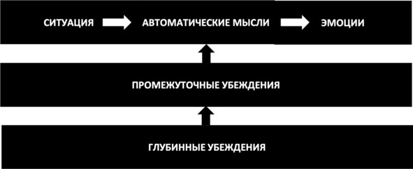 Так, чтобы не чувствовать себя слабым (глубинное убеждение), человек вырабатывает определённое правило жизни: «Я должен быть сильным». Чтобы не чувствовать себя беспомощным (глубинное убеждение), человек формирует правило «Я должен всё контролировать». Ещё один пример: чтобы не ощущать себя в опасности (глубинное убеждение «Мир – опасное место»), человек создаёт правило «Я должен всё контролировать и всем управлять». Таких правил (промежуточного уровня) может быть очень много: «Я должен быть умным», «Я должен быть лучшим», «Я должен добиваться успеха», «Я должен быть хорошим любовником», «Я должна быть хорошей мамой». Все эти правила – суть защиты, которые человек выстраивает внутри, чтобы не чувствовать себя глупым, беспомощным, плохим или не казаться таковым окружающим. Итак, глубинные, а также прикрывающие и обслуживающие их промежуточные убеждения образуют фундамент, который не осознаётся человеком и перманентно им управляет. В этой связи глубинные и промежуточные убеждения работают словно фабрики по производству автоматических мыслей, а в автоматических мыслях часто отображается содержание промежуточных и глубинных убеждений (см. рис. 14).