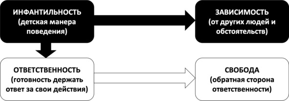 В этом отношении Сартр замечал, что успехи и провалы являются результатом свободного выбора самого человека, а поэтому перекладывание ответственности за те или иные события на других или обстоятельства недопустимо. В качестве единственного способа избежать поступков, за которые нужно отвечать, философ утверждал сознательное бегство в эмоции, порождающее реакции, не соответствующие ситуации, – страх, обморок и истерику. Эти эмоции, согласно Сартру, являются игрой, в которую верит человек, а также способом самообмана для избегания ответственности. Из этого следует заключить, что свобода – это обратная сторона ответственности, отсутствие которой порождает зависимость человека от других (см. рис. 15). Как замечает врач-психотерапевт Дмитрий Викторович Ковпак, свободу никто не даёт – свободу только берут. Если мы не отвечаем за своё поведение, то априори не можем быть свободными, поскольку возникает необходимость зависеть от другого человека, который нужен для того, чтобы решать наши проблемы за нас, как когда-то это делали наши родители, да ещё и нести за это ответственность, которую мы с себя снимаем. Поэтому обращение людей к психотерапевту зачастую выглядит как попытка сделать последнего ответственным за то, что будет происходить в их жизни. Но только вам решать, есть ли смысл держаться за прежние модели мышления и поведения, или полезнее начать постепенно меняться, принимая ответственность за свою жизнь. Итак, только сам человек является творцом своей жизни и, в том числе, своих проблем, но он же содержит в себе ключи для преодоления трудностей и ответы на все свои вопросы.