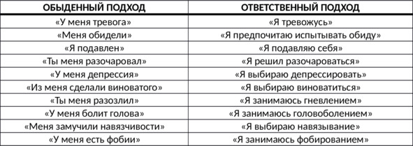 Сравните приведённые ниже высказывания и, что называется, почувствуйте разницу между обыденным подходом к собственной жизни и стремлением взять на себя ответственность за свои эмоциональные реакции (см. таб. 4).