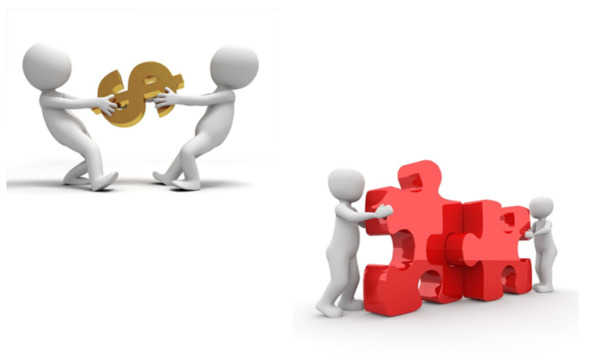 Начнём с философии переговоров. Существуют два подхода к переговорному процессу: направленный на конкуренцию и направленный на сотрудничество. Из названия становится понятно, что в одном случае стороны собираются выяснять, кто из них круче и кто должен обязательно выиграть любой ценой, во втором – как сделать так, чтобы обе стороны начали между собой сотрудничать. Выглядит это примерно так, как на рисунке: