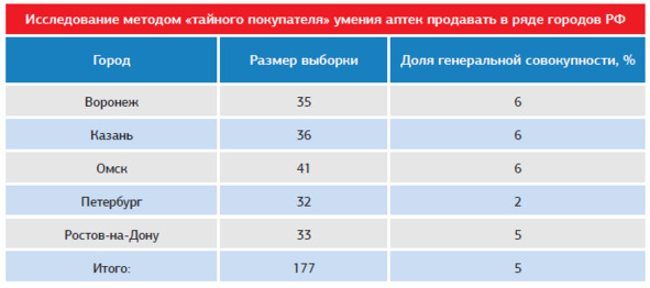 Подтверждение своей гипотезе я обнаружил ещё в 2016 году в статье господина А. С. Славича-Приступы (www.spct.ru), опубликованной в одном из номеров «Фармацевтического вестника» №42 от 22 декабря 2015 года. Автор провел независимое исследование « Тайный покупатель», посетив лично в городах-миллионниках разное количество аптек. Результат находится в таблицах №1 и №2 ниже по тексту: