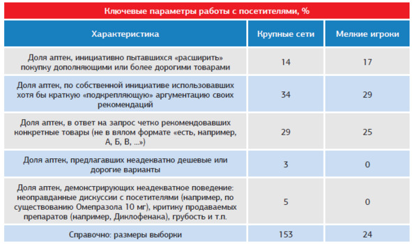 Привожу текст автора, комментирующий таблицу №2: …«Как видно из таблицы, коммерческая ориентация (навыки и мотивация продаж) у российских аптекарей по многим параметрам весьма низка. Особенно остра эта проблема в отношении инициативных рекомендаций с целью „расширить“ покупку дополняющими или более дорогими товарами. Разумеется, такие рекомендации уместны не всегда. Однако характерный для российских аптек уровень таких попыток (примерно 15%) с точки зрения нормального розничного бизнеса, что называется, „не лезет ни в какие ворота“: эффективное значение данного параметра не ниже 60—80%»…