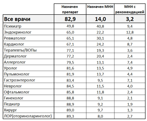 Кстати, о пресловутых заменах по МНН. Очень часто слышу от маркетологов компаний, с которыми работаю, что такая замена – просто стихийное бедствие. На самом деле, если обратиться к исследованию Ipsos Healthcare, PrIndex «Мониторинг назначений лекарственных препаратов», осень 2018, то проценты назначений по 3-м категориям: «Назначен препарат», «Назначен МНН» и «МНН с рекомендацией» из всех 100% назначений распределяются по специальностям следующим образом: