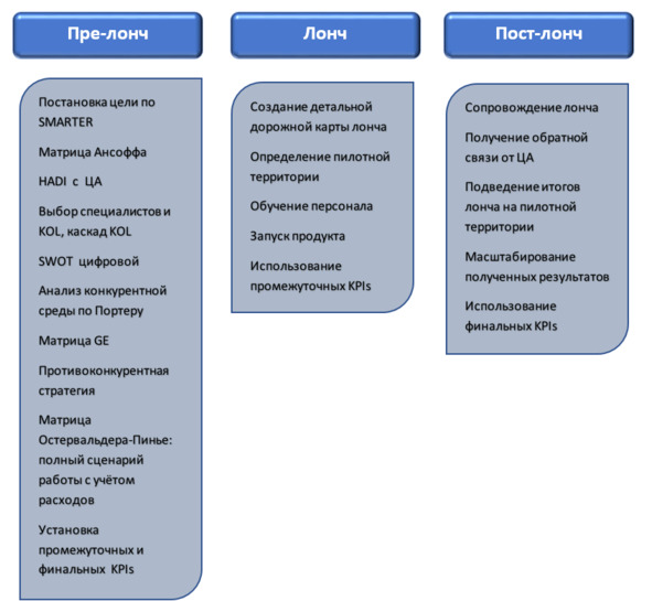 Лонч: дорожная карта лонча (проектный менеджмент), выбор «пилотной территории», обучение персонала и начало на ней запуска продукта. Использование промежуточных KPIs.