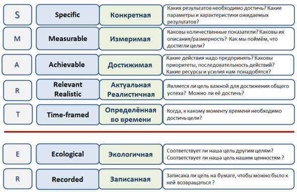 Во многих моих книгах я привожу подробное описание этого инструмента, вышедшего из более простой технологии SMART (SMARTER как более современную), которая, в свою очередь, была незаслуженно и напрасно примитивизирована многими тренерами при обучении менеджеров.