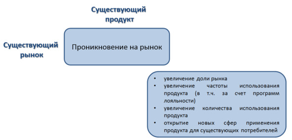 Вы можете работать со своим существующим продуктом на существующем рынке, проведя новое позиционирование или ре-лонч. Такая ситуация названа автором «проникновение на рынок».