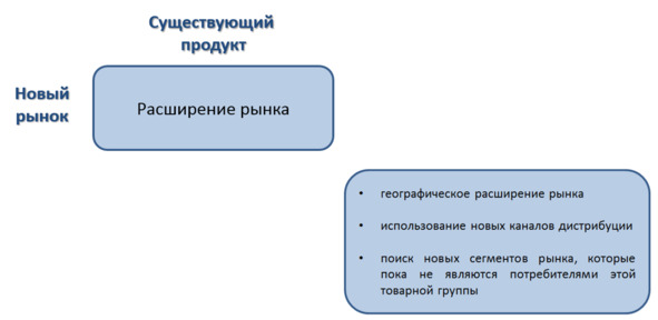 При выходе существующего продукта на новый рынок подразумевается географическое расширение сферы влияния, использование новых каналов дистрибуции. Необходимо подумать и о поиске новых сегментов рынка, которые пока не применяют эту товарную группу или АТС.