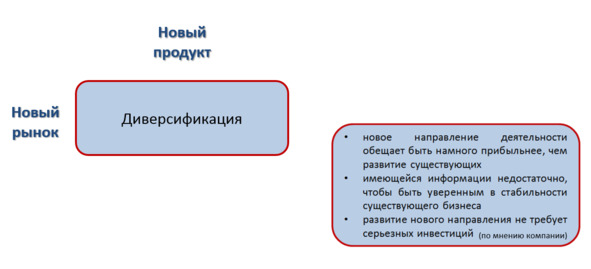 Ситуация, которую автор назвал «диверсификацией», подразумевает вывод нового продукта на принципиально новый рынок. В этом случае нужно понимать, что новое направление должно быть существенно прибыльнее старого, необходимо очень хорошо посчитать инвестиции в такой проект и обязательно учесть стабильность существующего бизнеса, чтобы инвестициями в новый рискованный проект не подорвать экономику организации.