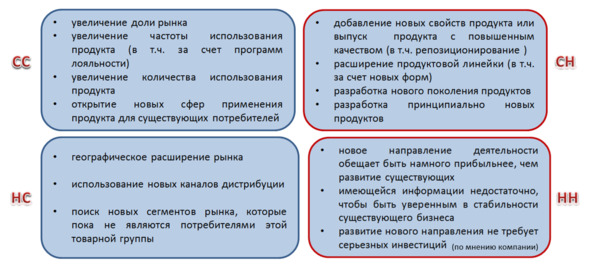 Для удобства все четыре варианта и рекомендуемую стратегию действий я свёл в одну таблицу. Расшифровка аббревиатур: СС – старый продукт на старый рынок, НС – новый продукт на старый рынок, СН – старый продукт на новый рынок, НН – новый продукт на новый рынок. Диаграмма – ниже: