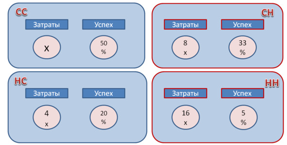 Важнейшей частью матрицы Ансоффа является сравнение примерных затрат для разных ситуаций и процент успеха, который ожидает компанию [9]. Если принять затраты за «1» для сценария СС, то успех такого сценария – 50/50. В сценарии НС затраты возрастают примерно в 4 раза против СС, успех гарантирован примерно в 20% случаев. Сценарий СН увеличит затраты в 8 раз с успехом в 33%, а самым высокозатратным будет вариант НН, при котором затраты в сравнении с вариантом СС возрастут в 16 раз при гарантии успеха всего в 5%.
