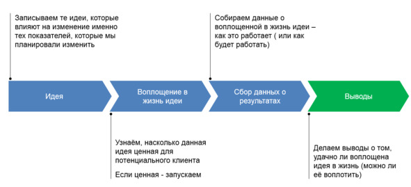 Затем появляется необходимость действий по сбору информации о том, насколько данная идея имеет ценность для потенциального клиента. Если да, то производим запуск, если нет, то нет. Это – A в HADI.