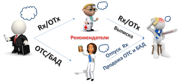 Вопрос первый: кто будет являться нашим клиентом? Тут важно помнить, что на фармрынке мы имеем дело с так называемыми «рекомендателями» – врачами и фармацевтами, которые сами не участвуют в приобретении препаратов, но влияют на принятие решения потребителем. Следовательно, клиентов, которые будут заинтересованы в наших Rx и ОТх – препаратах, будет две группы (врач-пациент), а для БАД и ОТС – две или три (врач-фармацевт-пациент). Объясню этот феномен фармрынка с помощью нижеследующей схемы: