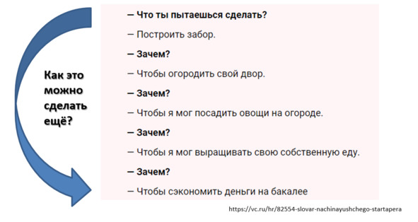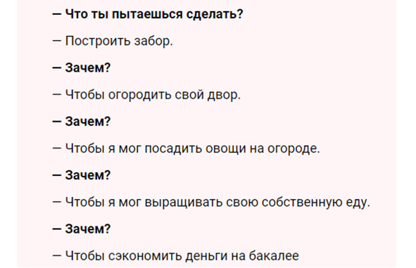 «Я хочу приготовить борщ». Желание. Переформулирую: «Что я должен сделать для того, чтобы приготовить борщ?». После этого мне придётся отвечать на вопросы, которые появятся сами собой :