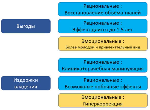 Приведу пример лонча одного косметологического продукта – филлера, для которого были разработаны рациональные и эмоциональные аргументы для пациента. Этой информацией компания вооружает врача, который при работе с пациентом сможет объяснить выгоды сделанного выбора и предупредить опасения, связанные с издержками владения.