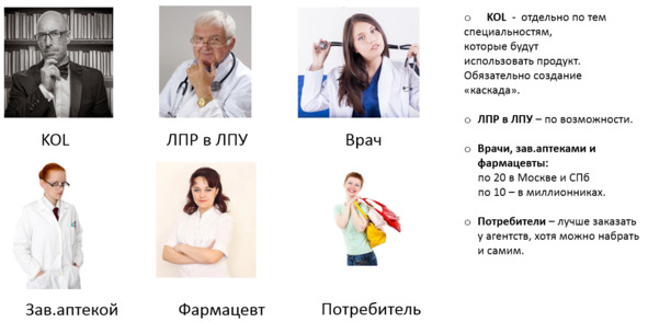 Для препаратов ОТх к данному списку добавятся ещё и фармацевты с конечными потребителями. Что касается БАД и ОТС, то я бы рекомендовал проводить интервью со всеми вышеперечисленными категориями интервьюируемых, кроме ЛПР в ЛПУ.