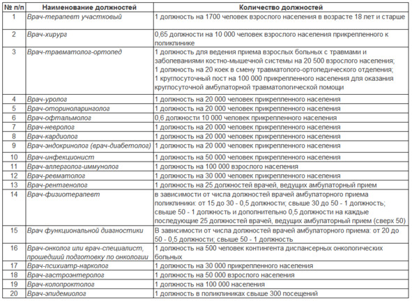 Приказ Министерства здравоохранения и социального развития РФ от 15 мая 2012 г. №543н «Об утверждении Положения об организации оказания первичной медико-санитарной помощи взрослому населению» описывает нормативы для введения ставок амбулаторных врачей: