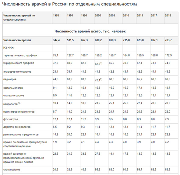 Теперь необходимо понять, сколько врачей таких специальностей находится в стране, а также в отдельных субъектах РФ. И тут статистика нам придёт на помощь. Правда, в открытых источниках буду разные цифры, отличающиеся между собой, но не сильно. Для подобного рода «прикидочных» расчётов всё вполне подходит.