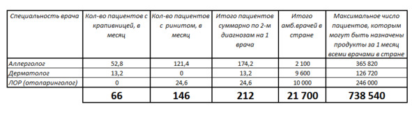 Будем в нашем примере считать, что 20% ЛОР и дерматологов работает в стационаре, а все аллергологи – амбулаторные, т. е. их 2 100. Амбулаторные ЛОРы, соответственно – 10 тысяч специалистов, дерматологи – 9,6 тысяч.