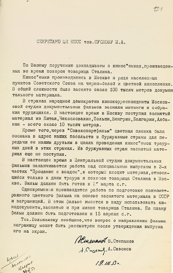 Докладная записка Отдела художественной литературы и искусства ЦК КПСС М.А. Суслову о киносъемках похорон И.В. Сталина