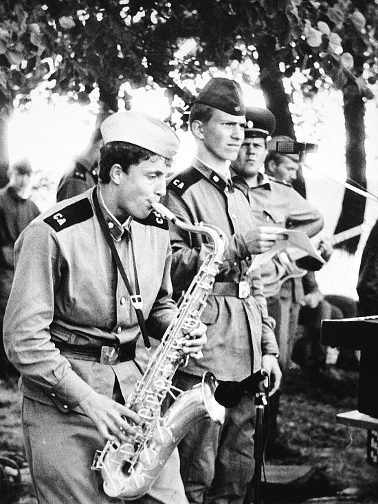 Тем не менее, в армии я выучился играть на саксофоне. В любой так называемой части должен быть оркестр. Без музыки там никуда, конечно. Прапорщик-белорус провел опрос, кто и на чем умеет играть, однако на мой ответ, что я умею играть на баяне, интереса проявлено не было. Мне пришлось соврать наполовину, что я умею играть на саксофоне. На самом деле, я за три месяца до армии купил саксофон, но играть на нем научиться на успел, конечно. Вообще, в армии инструментом является только духовой инструмент, ну или ударный как минимум. Прапорщик заинтересовался мной, и взял меня в музыкальный взвод с условием, что мне родители вышлют саксофон. И дальше было условием за две недели выучить сорок маршей. Стимулом учить было то, что если ты не сдаешь в день два или три марша, то сержант посылает тебя чистить так называемые «очки», и их чистить уже нет смысла, потому что они уже давно были убиты. Кстати, очень странное дело, но чистили их почему-то красным кирпичом. Видимо, это продолжение той известной присказки о том, что в армии «круглое носят, а квадратное – катают». В армии мой ум страдал действительно, потому что он искал во всех действиях логику… которая отсутствует. Хотя, кто знает, может какой-нибудь химик мне однажды объяснит, почему железные никелированные толчки мы чистили красным кирпичом.