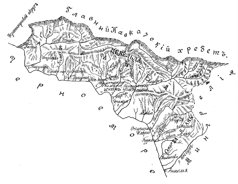 Абхазия в этнографическом отношении состоит из трех частей: Абхазии, Самурзакани и Цебельды. Абхазия занимает пространство от Гагр и до реки Окум, Самурзакань – от реки Окум до Ингура и Цебельда занимает место в юго-восточной части. В административном отношении Абхазия разделена на четыре округа: Гудаутский с городом Гудауты, Гумистинский с городом Сухум-Кале, от Псыртсхи и до Кодора, Кодорский – с городом Очемчиры, до реки Гализги, и Самурзаканский с городом Окумы.