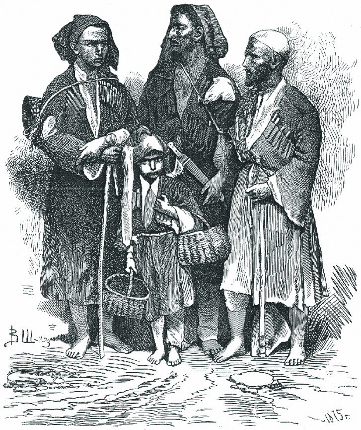 Абхазцы – народ очень рослый и прекрасно сложенный. Черты их лица приятны, но очень крупны и резко выдаются. Их правильный нос загнут крючком. Глаза черные, остро выглядывающие из-под нависших бровей. Огромное большинство абхазцев брюнеты, но попадаются огненно-рыжие с голубыми глазами. Сохраняя усы и бороду, они все бреют голову. Костюм обычный, кавказский: получеркеска, бешмет, узкие штаны и сандалии. Абхазец всегда с башлыком, которым он кокетничает, то распуская его концы по плечам, то завязывая на голове наподобие чалмы, как носят в Гурии. Прежде абхазцы носили папахи, ныне ограничиваются мингрельскими шапочками. При абхазце всегда много дорогого и красивого оружия, и уж во всяком случае кинжал.