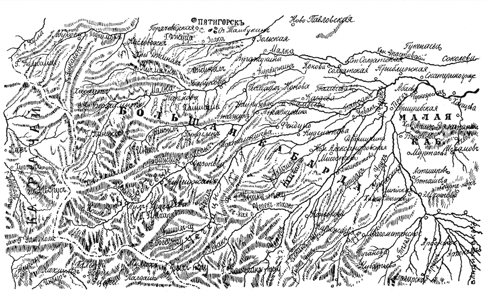 Кабарда занимает среднюю часть Северного Кавказа. Ее положение в общем находится по Главному Кавказскому хребту, почти между Эльбрусом и Казбеком. Границы Кабарды будут: с севера – река Кума по Джиналу, Малка и Терек до Моздока, с востока – Чечня, с юго-востока – Кабардинско-Сунженский хребет, отделяющий Кабарду от Осетии, на юге – Передовой хребет, за которым лежат татарские поселения: Балкар, Безенги, Чегем, Хулам и Урусбий, с запада Эльбрус и часть Главного хребта отделяют Кабарду от Карачая и абазинцев. Вся Кабарда (66 189 жителей) во всей своей целости делится Тереком на две части – Большую, или западную, Кабарду и Малую, или восточную, Кабарду.
