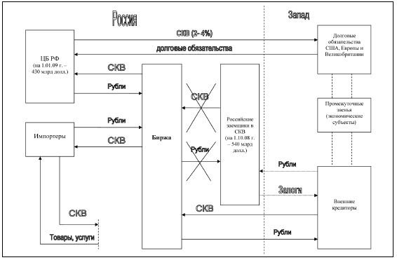 Исходя из анализа причин возникновения экономических, политических и финансовых кризисов, можно остановиться на нескольких важнейших проблемах, которые являются факторами повышенного риска российской экономики. Речь идет о структуре платежного баланса, общей суммы накопленного внешнего долга и утечки капитала. Кроме этого, существует еще один немаловажный фактор, на который ни один из экономистов и экспертов по функционированию отечественной экономики не обращает внимания, несмотря на то, что он является одним из важнейших негативных моментов, который не позволяет осуществлять эффективную денежно-кредитную политику, – существенная зависимость экономики от СКВ.