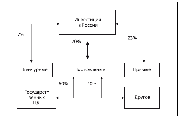 Проанализировав платежный баланс РФ за несколько лет в области инвестиций, можно сделать вывод, что, в зависимости от прогнозируемой экономической ситуации в будущем, поток инвестиций в РФ изменяется как по величине, так и по соотношению между прямыми и портфельными инвестициями. Из этого следует, что большинство инвестиций в РФ являются портфельными, которые при ухудшении ситуации в стране моментально «уходят» из России. Внешние инвестиции в Россию можно представить следующей блок-схемой (рис. 2).