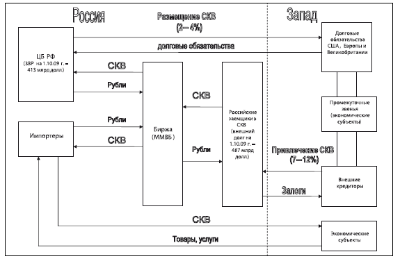 Данная ситуация в экономике сложилась из-за допущенной «системной ошибки», которая в полной мере способствовала ее созданию, (рисунок 1) – (в основном кредитования российских предприятий) в российскую экономику. Основной вывод: валютные риски по кредиту со всеми отрицательными последствиями полностью перенесены на заемщика. Что это значит? Основное – невозможность проведения ЦБ самостоятельной (независимой от внешних кредиторов) денежно-кредитной политики.