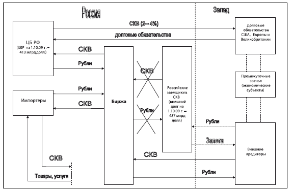 СКВ в размере 400 млрд долл. США, становится запредельной величиной – 14,4 трлн руб. (курс долл./руб. – 36), а его общая величина приближается к 17 трлн руб. (с учетом долга, номинированного в рублях). Таким образом, с прежних 12,5 трлн руб. (курс 25 руб./ долл, плюс номинированная часть внешнего долга в национальной валюте в размере 2,5 трлн руб.) возрастает на 4,5 трлн руб. Кроме этого, увеличивается и расходная часть финансовых средств, которая идет на выплату процентов и погашение основной суммы займа. К вышеупомянутым действиям (девальвация национальной валюты) добавляется еще один негатив – рост уровня процентных ставок (политика дорогих денег, применяемая для снижения уровня инфляции и оттока капитала). При прочих равных условиях это влияет на сальдированный финансовый результат предприятий, величина которого в 2008 году составляла 4 трлн руб. То есть он уменьшается на разницу в процентных ставках для всех заемщиков и на курсовую разницу в случае погашения долга. Итого в 2009 году только за счет двух факторов сальдированный финансовый результат организаций имеет потенциал снижения на 1,8–2 трлн руб. (на 50 %). Следует заметить, что мы не учли расходов по другим кредитам; снижение общего уровня производства, падение капитализации компаний и т. д. Необходимо учитывать, что экспортеры получают дополнительную прибыль в рублях, но в то же время потери несут импортеры. Таким образом, вновь усиливается перекос в экономике в пользу сырьевой составляющей. Негативным моментом является сравнение относительных и абсолютных показателей экономики. ВВП страны в 2008 году – 41,54 трлн руб. (в текущих ценах). Денежная масса – 12 трлн руб. (на 01.03.2009 года). Думаю, что приведенных данных достаточно для того, чтобы понять масштаб негативного влияния существующей финансовой (валютной) политики государства на отечественную экономику. В качестве дополнительных отрицательных последствий можно добавить: снижение уровня налогооблагаемой базы (400 млрд руб.), сокращение инвестиционных расходов организаций и др. Примеров негативных последствий существующей валютной политики достаточно, чтобы говорить о том, что она порочна и деструктивна для развития всех сегментов российской экономики.