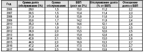 За последние десять лет общая задолженность США возросла на 80 %. Следует иметь в виду, что данный процесс происходил в период относительно низких процентных ставок. Исходя из упрощенного расчета, обслуживание общего долга США при ставке в 5 % составляет не менее 1,2 трлн долл, в год, или 10 % ВВП. Динамика роста общей задолженности США и существенная сумма по его обслуживанию позволяют с большой уверенностью предположить, что у субъектов экономической деятельности США (включая все органы власти) нет альтернативы, кроме наращивания общей величины внутреннего долга. Кроме того, каждый процент увеличения стоимости обслуживания влечет за собой не менее 260 млрд долл, дополнительных расходов, что в свою очередь приводит к увеличению общей суммы долга. С 2000 года общая задолженность по долговым ценным бумагам возросла с 16 трлн до 24,7 трлн долл, в 2005 году (рост приблизительно на 2 трлн долл, в год). Кроме того, задолженность увеличилась за 2000–2002 годы – на 2,5 трлн долл.; за 2002–2004 годы – на 3,8 трлн долл.; за 2004–2005 годы – на 2,3 трлн долл. Экстраполируя данные по увеличению ВВП в год на 3 % и процентной ставки 5 %, можно получить результаты, приведенные в табл. 1.