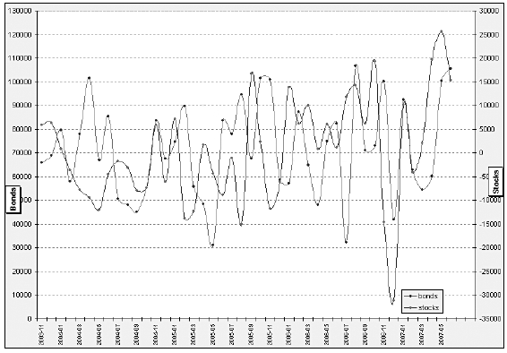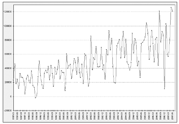 В настоящее время мир переживает высокие цены на сырье, можно сказать, исторически высокие, отличающиеся от среднеисторических не менее чем на 100–300 %. Страны – экспортеры сырья, получив излишек валютных средств, активно наращивают потребление импорта, с одной стороны, увеличивают социальные обязательства и объемы внешних инвестиций, с другой стороны. Кроме того, наблюдается активный приток в большей степени портфельных инвестиций в страну, которые осторожно можно назвать спекулятивными. Существуют разные трактовки спекулятивного капитала. Как правило, у основной части населения данный вид финансовых ресурсов ассоциируется с негативными вещами. Когда я говорю «спекулятивный капитал», то основной критерий – высокая мобильность, напрямую зависящая от экономической ситуации в стране инвестирования. Если ситуация ухудшается, то идет массовый возврат ранее инвестированных средств. Не исключаю, что не менее 60 % портфельных инвестиций составляют ранее выведенные из страны капиталы.