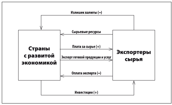 Так как крупнейшим западным державам невыгодно создавать себе конкурентов, то для реализации собственных товаров вне пределов своей страны они вынуждены создать условия, позволяющие другим странам закупать их продукцию. Другими словами, у государств-импортеров должны быть валютные средства. Для одной группы стран, имеющих ресурсы, будет вполне достаточно «закачать» СКВ за счет увеличения стоимости сырья. Странам, у которых нет природных ресурсов, можно предоставлять займы, позволяющие производить закупки у развитых стран. В общем виде движение сырья, готовой продукции и инвестиций отражено на рисунке. Так ли это на самом деле, имеются ли в виду управляемые циклы стоимости сырья и капитала, сказать достаточно сложно, но определенная доля истины явно присутствует.